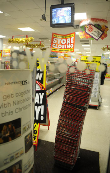 Updated: 2008-12-28 16:12 Baskets are seen at a closed Woolworths store in Clapham, south London December 27, 2008. Administrators began closing the stores of Woolworths, one of Britain's best known retailers, on Saturday. The household name, which sold everything from chocolate bars to toasters and televisions, is the highest profile retail casualty of the global financial crisis and Britain's economic downturn. Woolworths collapsed into administration in November and its administrators said earlier this month all its stores would close by Jan. 5, with the loss of 27,000 jobs, unless a last-minute buyer could be found. [Agencies]
