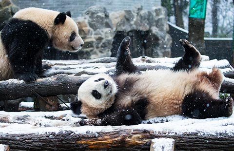 Pandas roll and tumble as they enjoy the first now in Hangzhou