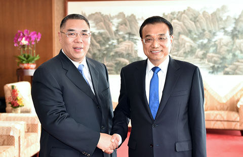 Premier Li Keqiang met Macao SAR chief executive Chui Sai On in Macao on Oct 10.