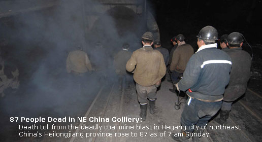 The death toll from a gas explosion in a coal mine in northeast China's Helongjiang Province has risen to 87, with 21 other miners still trapped.