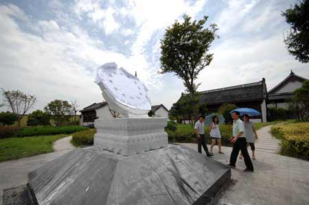 People watch the newly-installed equatorial sundial, measuring 1.5 meters in diameters, donated by the National Observatory to mark the spot for observation of the forthcoming 2009 total solar eclipse on the Yangtze Valley, believed to be the longest one visible in the century that is to betide on July 22, in Haining, east China's Zhejiang Province, July 15, 2009. [Xinhua] |