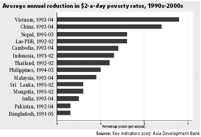 Thus, while the $2-a-day poverty rate in China was as high as 64.5 percent in 1993, it had fallen to 37.8 percent by 2004. Once again, very few countries can match such a large reduction in poverty in a matter of just about a decade. This can be clearly seen from the chart, which describes the implied average annual percentage point reduction in poverty rates for developing Asian countries for which data on poverty rates from the early 1990s is available. Along with Vietnam, China is the only other country experiencing a reduction in $2-a-day poverty rates of two percentage points or more per year on average since the early 1990s.