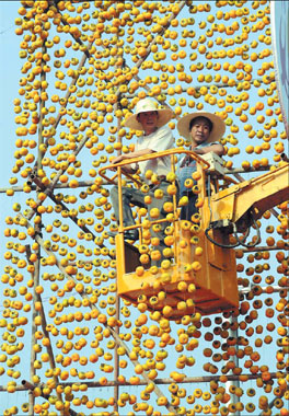 Villagers tend to persimmons hung up to dry from a bamboo scaffolding in Gongcheng, the Guangxi Zhuang autonomous region. [Xinhua]