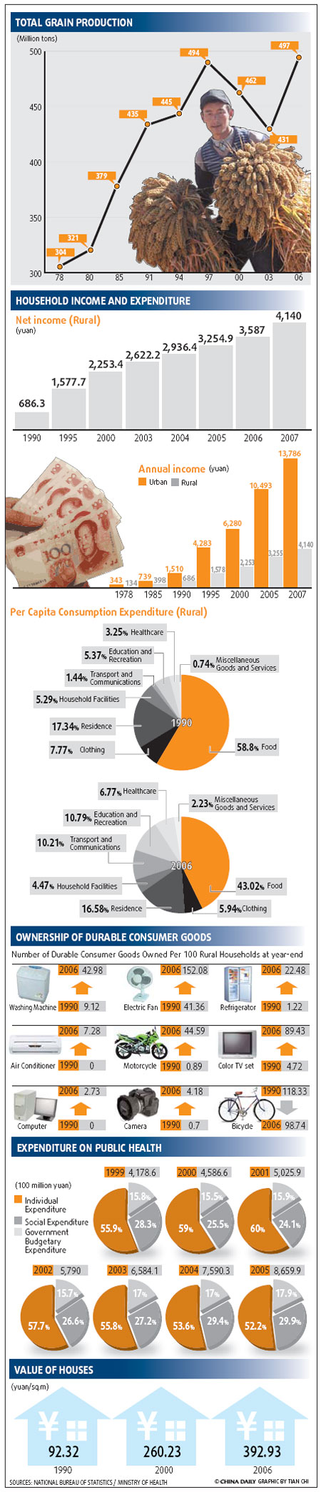 To tackle the problem, the central government quintupled its spending from 2002 to 2007 to boost rural infrastructure. Under its "new countryside program", it abolished the centuries-old rural agriculture tax, made the nine-year compulsory education free for rural children and subsidized agriculture production. All these have lifted farmers' living standards and provided them better social security.