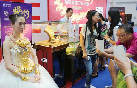 A model displays gold jewelry weighing a total of 3.5 kg at a trade show in Fuzhou, Fujian province,June 19, 2014. The model weighed down by the heavy ornaments, sits as she is photographed by visitors. [Photo provided to China Daily] |