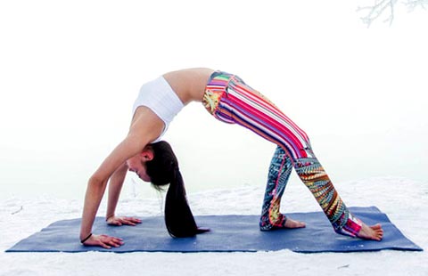 A Chinese woman practices yoga in front of rime-covered trees along the Songhua River in Jilin city, northeast China's Jilin province, Dec 17, 2014.
