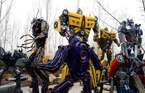 Liu Xianhui, a farmer in Zhangqiu city, has organized a team of 11 farmers to assemble robot modeled after the "Transformers" by using materials of used cars.