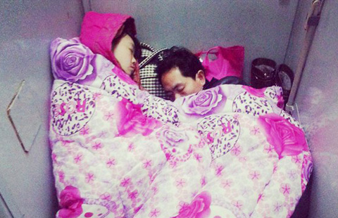 Tired from a long day at work or play? These Chinese people are. Sleepiness strikes anytime, anywhere. A couple sleep under a quilt in the corner of a railway carriage on Jan 12, 2014.