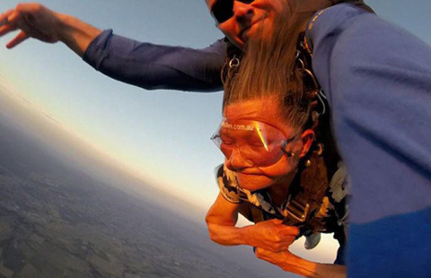 An 81-year-old Chinese lady, surnamed Min, enjoys skydive with the help of an instructor in Australia. She was attracted to the exciting sports during a visit to her son's home in Australia.