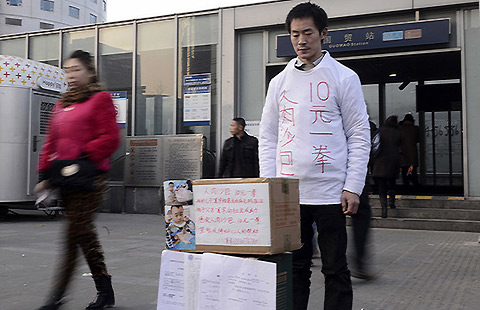 Xia Jun stands in front of a subway entrance at Guomao Station in Beijing, begging for punches in return for donations for his two-year-old son, who he says has been diagnosed with leukemia.