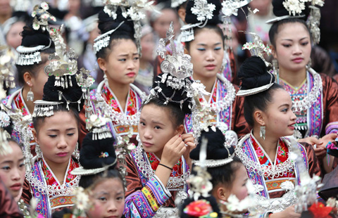 Singers from the Dong ethnic group prepare for a performance in Congjiang, Guizhou province, on Nov 28.