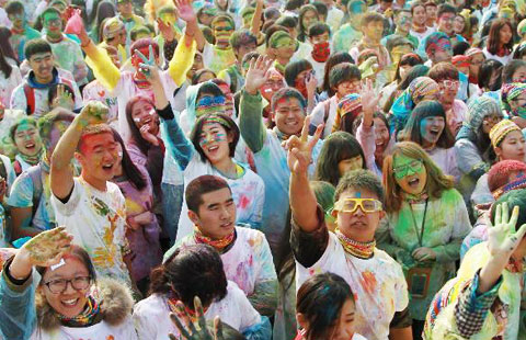 Runners take part in a color run in Dalian, northeast China's Liaoning province, Nov 29, 2014. Over 2,000 runners participated in the 5-km fun run.