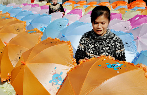 More than 500 women farmers are engaged in the umbrella processing work in Dexing city, East China's Jiangxi province, that are then exported.
