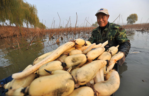 Lotus root, a crop commonly seen in Southern China, has been grown for the first time in a fishpond in Qingdao, Northern China's Shandong province.