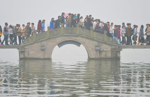 An arched bridge over Yongjin River is shrouded by heavy fog in West Lake. The city’s meteorological observatory issued a yellow alert and forecast visibility of less than 500 meters and rain.