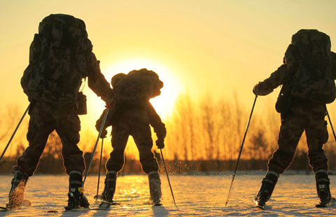 Soldiers of border guard regiment, China's Shenyang Military Region, located in Northeast China near the border with Democratic People's Republic of Korea are seen taking skiing instructions on November 13, 2014.