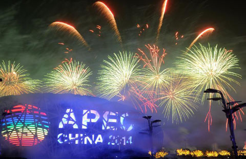 Photo taken on Nov 10, 2014 shows the night view of the National Gymnasium and the National Aquatics Center and their surroundings ahead of the 22nd Asia-Pacific Economic Cooperation (APEC) Economic Leaders' Meeting in Beijing.