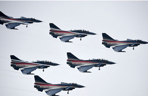 J-10 jet fighters of the Bayi Aerobatic Team of the Air Force of the Chinese People's Liberation Army perform at the 10th China International Aviation and Aerospace Exhibition in Zhuhai, Guangdong Province on Nov 11.