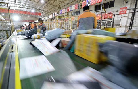 Workers transfer outgoing packages at an industrial park in Hefei, east China's Anhui Province, on Nov 11, a holiday of "Singles Day" that has become China's busiest online shopping day.