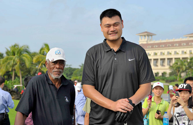 Retired basketball star Yao Ming, right, poses for photos with American actor Morgan Freeman during a session of the World Celebrity Pro-Am golf tournament in Haikou city, Hainan province, Oct 24, 2014.