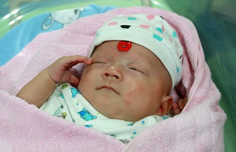 Prematurely born Peng Ankang, whose name literally means "safe and healthy", strikes an OK gesture at a hospital in Loudi, Hunan province, Oct 23, 2014.
