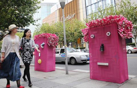 Some boxes containing electrical equipment on a major road in Shanghai have been decorated with daily items, and their 'hair' generated with maps to create innovative designs.