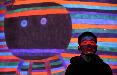 Xu Li (an alias), who suffers from autism-related mental impairment, poses with his work at Nanjing Tiancheng Art Center in Nanjing, capital of south China's Jiangsu province.