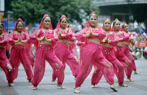 Elderly women join a group dance in Chongqing, a major city in Southwest China, Sept 16, 2014.