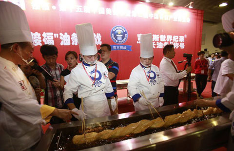 Cooks use chopsticks to check whether the deep-fried dough stick, measuring a whopping 3.732 meters, is ready in Wuhan, Central China's Hubei province on Sept 24.
