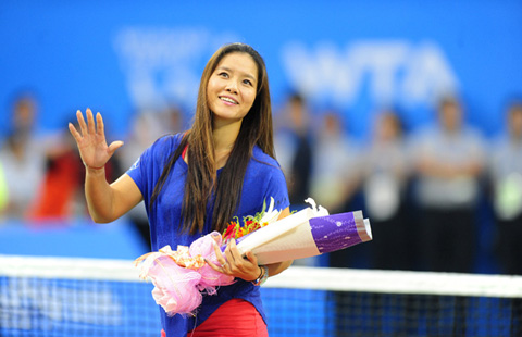 Chinese twice Grand Slams winner Li Na, right, poses with Danish tennis player Caroline Wozniacki during a brief retirement ceremony during the 2014 WTA Wuhan Open tennis tournament in Wuhan city, Central China's Hubei province, September 23, 2014.