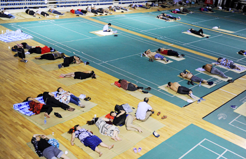 Parents sleep on the floor in a stadium at Shenyang Aerospace University in Shenyang, capital city of Northeast China's Liaoning province, Aug 30, 2014.