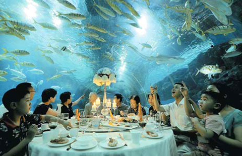 Visitors to Haichang Polar Ocean World in Tianjin enjoy food and drinks in the venue’s underwater tunnel on Monday, enabling them to watch the fish as they enjoy refreshments with their families.