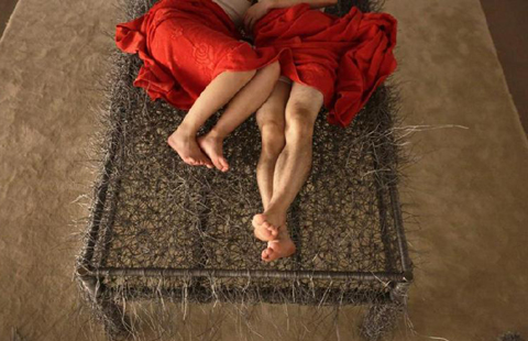 Chinese artist Zhou Jie (L) and her boyfriend Lian Xi hug while sleeping on an unfinished iron wire bed, one of her sculptures, after midnight at Beijing Art Now Gallery, in Beijing Aug 20, 2014.