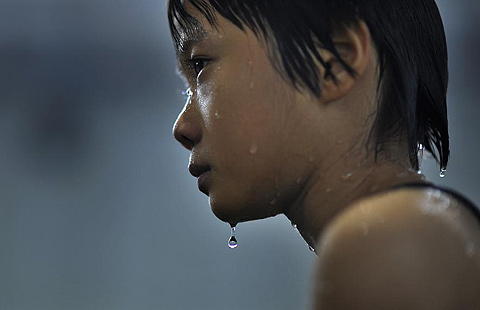 Young divers, who are prepared for a provincial competition in the coming days, stretch as they hang from a steel bar during a training session at a sports school in Hefei, Anhui province Aug 23, 2014.