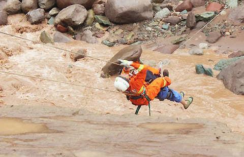 A fireman uses rope pulleys to evacuate a man stranded in Shibao town, Xishui county in China's Southwest Guizhou province, after a powerful rainstorm battered the area, Aug 12, 2014.