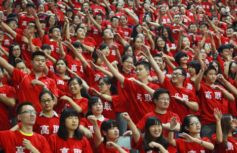Students perform a group dance to the Chinese pop song Little Apple at a gymnasium in Jinan city, east China’s Shandong province, Aug 13, 2014.