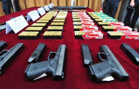 Captured weapons are displayed in Wuhan, capital of Central China's Hubei province, Aug 13, 2014. A large weapon smuggling case has been cracked by Hubei police recently, with eight suspects arrested and 16 illegal guns and 1,789 rounds of ammunition captured.