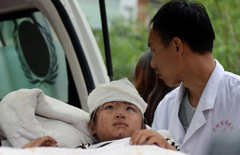 A child injured in a 6.5-magnitude quake is being transferred to a vehicle in Ludian county, Southwest China's Yunnan province, Aug 4, 2014.