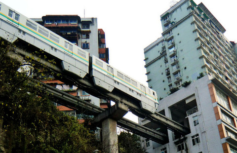 A light rail passes through a building in Chongqing. The complex landform of Chongqing brings this unique scene of Chongqing's light rail.