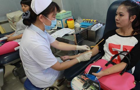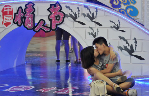 Couples compete in a kissing contest outside a jewelry store in Jiujiang, Jiangxi province, on Thursday ahead of Chinese Valentine’s Day.