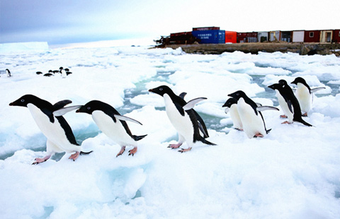 Adelie penguins walk past the Zhongshan Antarctic Station, Jan 9, 2015. Breeding penguins were often seen near the Zhongshan Antarctic Station during the summer time.