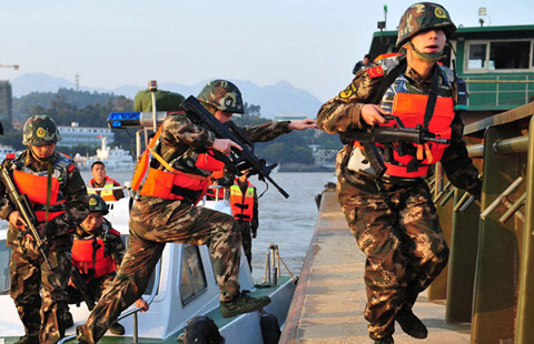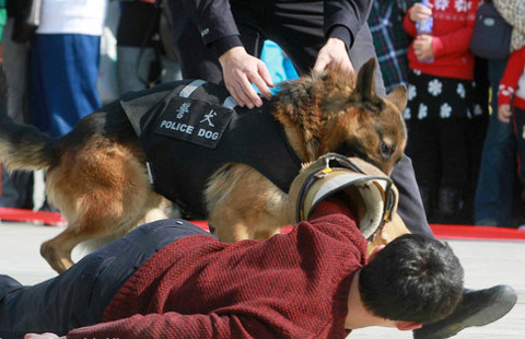 A police dog nabs a suspect at a training session in Xiamen, Fujian province, Jan 10, 2015. The day marked the 29th anniversary of the establishment of the "110" police calling system in China.