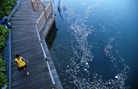 Dead fishes are floating on the Yundang Lake in southeast China's Fujian Province after the city was hit by large waves caused by Typhoon Matmo on July 26,2014.