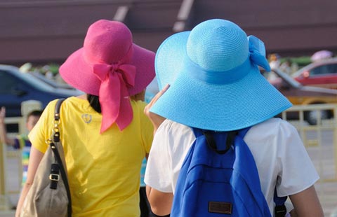 Tourists on Tian'anmen Square use various methods to cool off, July 26, 2014. With temperatures hovering around 36C, Beijing's Meteorological Bureau issued a three-day yellow warning heat alert on July 25.