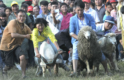 Villagers in Dafang county in Guizhou province take part in a sheep-and-goat-riding contest during the Torch Festival, a traditional event held by members of the Yi ethnic group, on July 26, 2014.