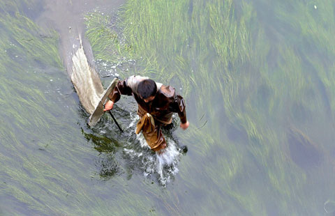 A group of workers have been heading to the Qinghe River in Tiantongyuan, northern Beijing to try and catch underwater worms, which they can sell as fish food.