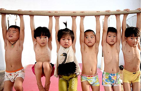 Children receive training in a gymnastics training centre during summer vacation in Bozhou, East China's Anhui province, July 9, 2014.