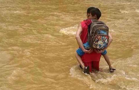 Teachers from a primary school in Yunnan province carry students across a raging river to school.