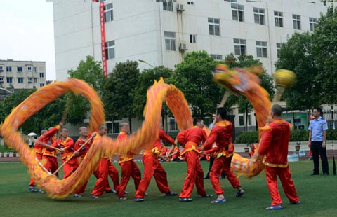 Prisoners drill for a dragon dance performance in a reformatory for juvenile delinquents in Nanchang,Jiangxi province, believing that the traditional show will help them learn to respect and cooperate with the others.