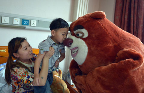 An animation producer sent performers 1,650 km to Chongqing to visit a 4-year-old boy suffering with a brain tumor. Playing the child's favorite roles from the cartoon Boonie Bears, they put on a special show.